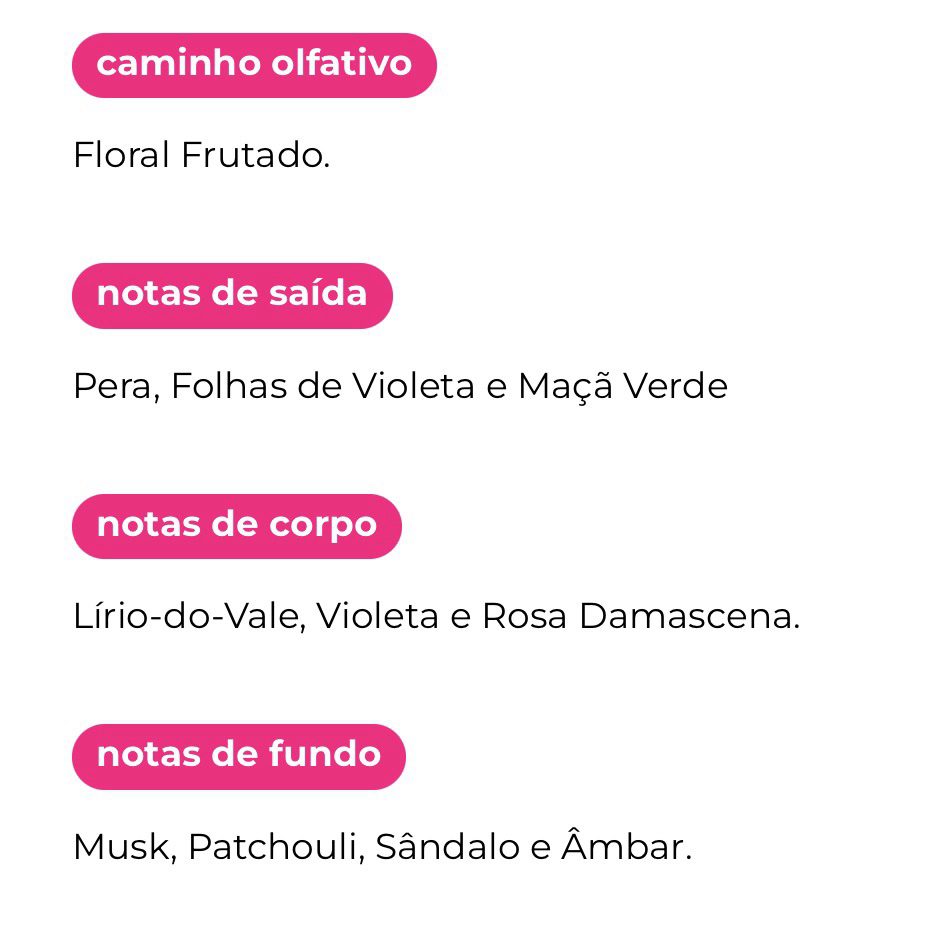 O Desodorante Colônia Body Splash Perfect pear ressignifica a beleza feminina em força e sutileza. Em uma essência leve e cítrica, celebra um toque clássico frutado, exalando delicadeza e frescor. Sua fragrância combina o coração floral refrescante de maçã verde e folhas de violeta, finalizando com elegância em um fundo doce e amadeirado.