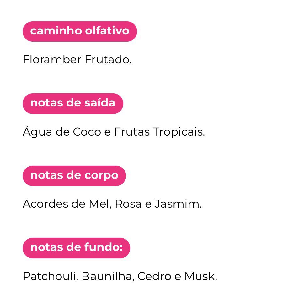O Desodorante Colônia Body Splash Wepink Vanilla Dream representa a felicidade dos momentos de carinho, através de seu toque floral delicado em notas de rosa e jasmim. Deixe-se celebrar sua força e transmitir serenidade em um toque de mel por onde passar, combinando harmonia, calma e afeto em um fundo doce e amadeirado.