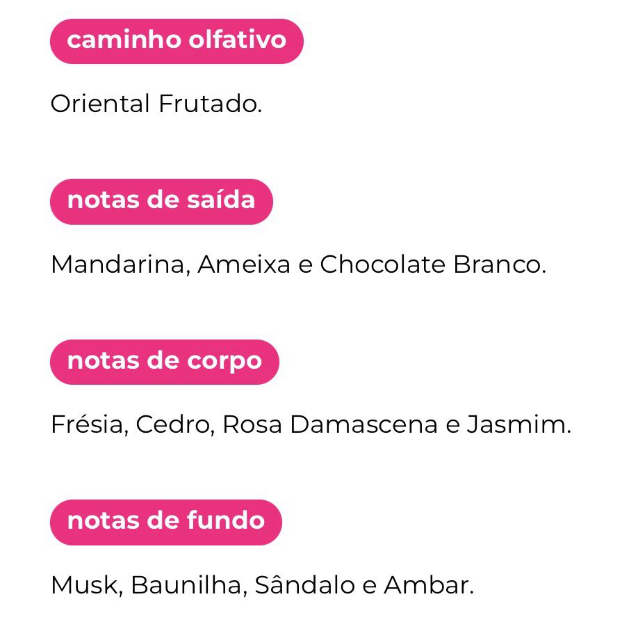 O Desodorante Colônia Body Splash Vanilla Hugdesperta o poder feminino, através de seu toque frutado envolvente em notas de ameixa e mandarina. Evolui em Um coração frutado, em harmonia do jasmim e rosa damascena. Deixe-se celebrar sua força e transmitir encanto por onde passar, combinando beleza, desejo e frescor em um fundo doce e amadeirado.