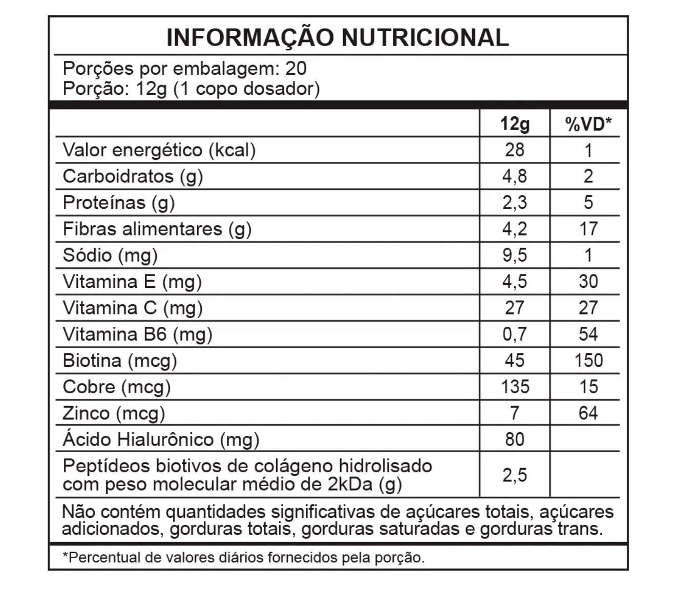 Além disso, esse suplemento em pó é rico em Vitamina E, C, B6, Biotina, Zinco e Cobre, ajudando a combater a flacidez, fortalecer as unhas e promover uma pigmentação saudável para cabelo e pele.