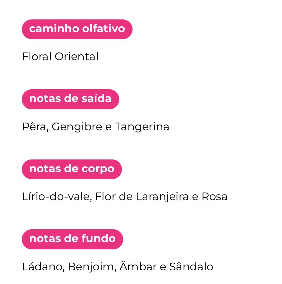 O fundo quente e envolvente de ládano, benjoim, âmbar e sândalo traz profundidade e conforto, deixando um rastro elegante que acompanha a rotina com leveza e refinamento.