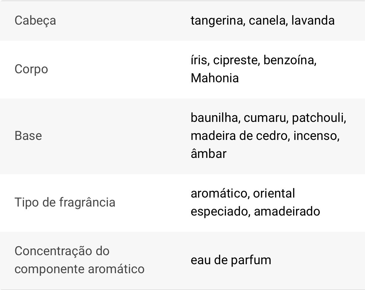 A abertura apresenta uma combinação brilhante de tangerina, canela e lavanda, acrescentando energia e um toque subtil de sensualidade picante. Segue-se uma rica camada de notas florais, íris, cipreste e aromas resinosos. O final da fragrância é quente, profundo e inesquecível: baunilha doce, fava tonka picante, patchuli terroso, cedro, incenso e âmbar cinzento criam um rasto sofisticado e cativante.