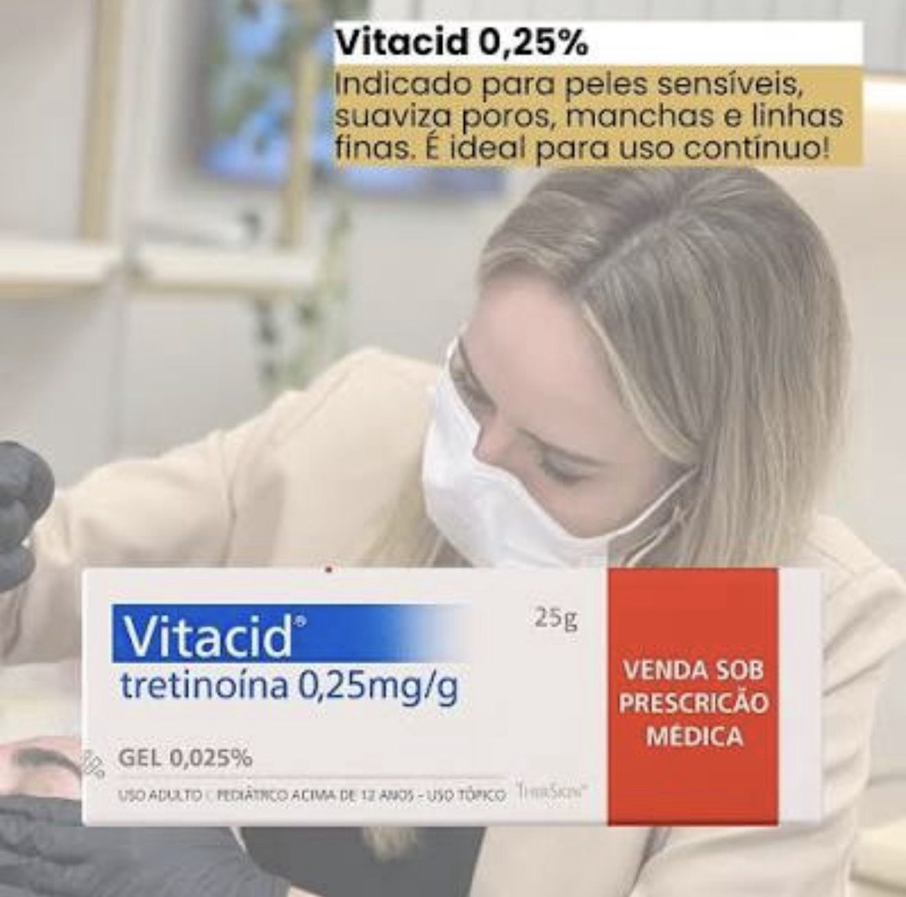 Gel dermatológico à base de tretinoína, indicado para o tratamento da acne, auxiliando na desobstrução dos poros e na redução de cravos e espinhas. Também é utilizado para melhorar a textura da pele, suavizar manchas, linhas finas e auxiliar na renovação celular, sendo uma opção com concentração adequada para peles sensíveis e uso contínuo, conforme orientação médica.