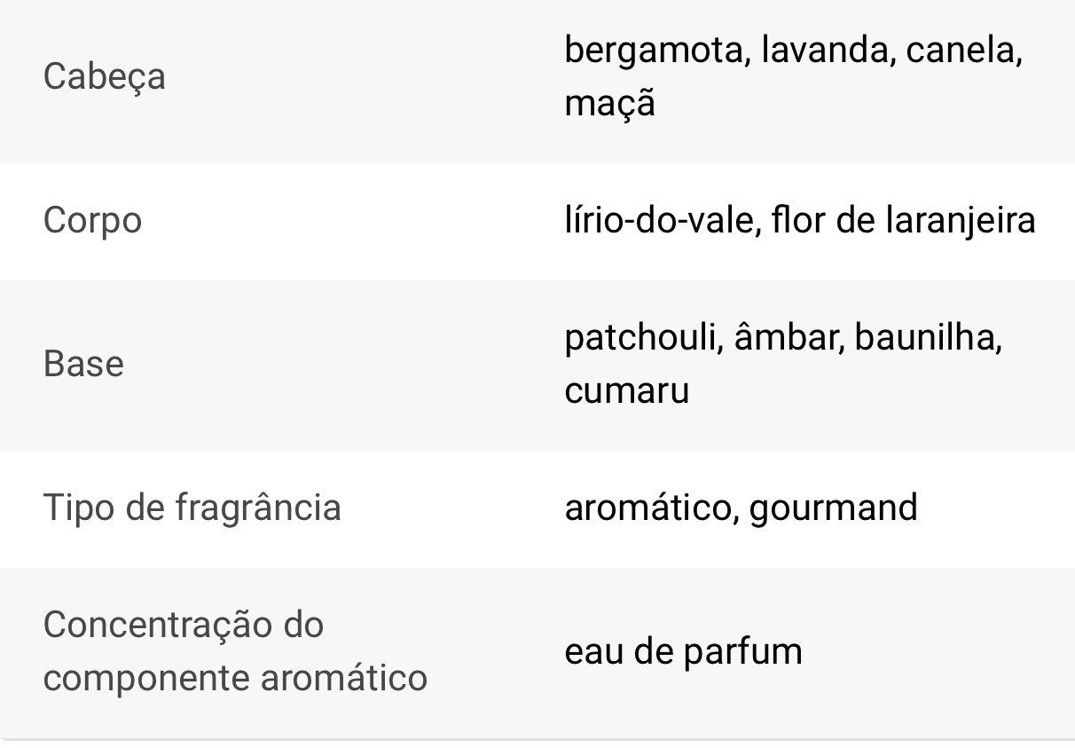 Primeiro, encontra notas frescas de bergamota e lavanda que se misturam com um toque de canela e maçã. Pouco depois, é encantada pelo coração floral com notas de lírio-do-vale e flor de laranjeira. Por último, as notas quentes de âmbar e patchuli que, em conjunto com um toque doce de baunilha e cumaru, asseguram um fim agradável.