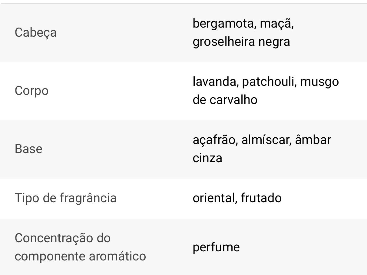 Ao cheirar esta fragância, será conquistado pela abertura frutada com notas de bergamota, maçã e groselha-negra. Após algum tempo, desperta a lavanda fresca, combinada com notas de patchouli e musgo de carvalho. Durante muito tempo, vai desfrutar da fusão irresistível entre o precioso açafrão, o sensual almíscar e o âmbar-cinzento.