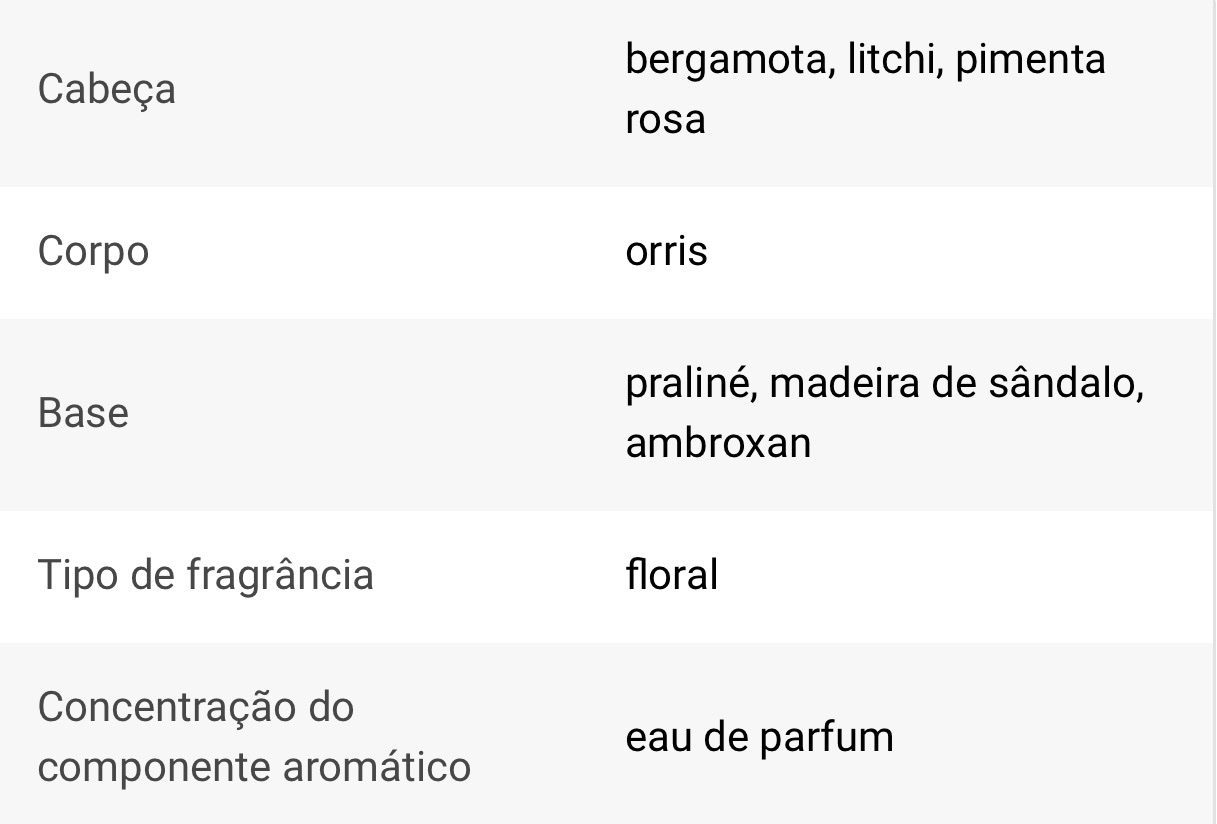 Na cabeça, aparece uma combinação radiante de citrinos e frutos exóticos que dá frescura e energia à fragrância. Seguem-se notas de flores nobre e especiarias quentes que proporcionam feminilidade e profundidade ao perfume. A base é criada por âmbar luxuoso, almíscar macio e madeira suave e cremosa que dão um requinte aveludado e sensualidade à fragrância.