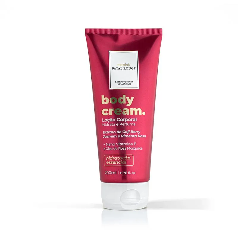 A Loção Desodorante Body Cream Wepink Fatal Rouge aprecia a essência de uma mulher destemida e fatal, proporcionando um toque macio, hidratação, nutrição e firmeza. Sua composição auxilia na produção de colágeno e regeneração celular, além de deixar a pele com um aspecto saudável e brilhoso. Sua jornada sensorial sedutora e elegante possui um caminho Floral irresistível, evoluindo com o encanto em notas de Cassis e Pimenta Rosa. Sua essência se revela em um golpe fatal por um fundo doce e amadeirado, encantando por onde passar.