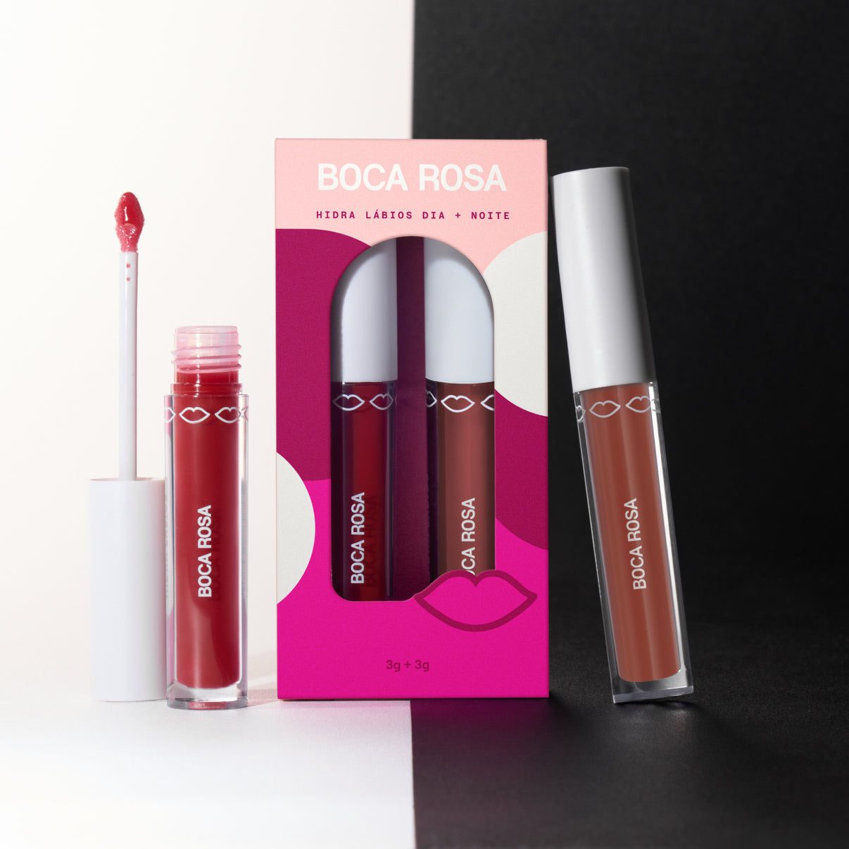 O Combo Dia e Noite Hidra Vermelho + Hidra Bege foi desenvolvido para cuidar dos lábios ao longo de 24h, unindo hidratação intensa com acabamento bonito e confortável.