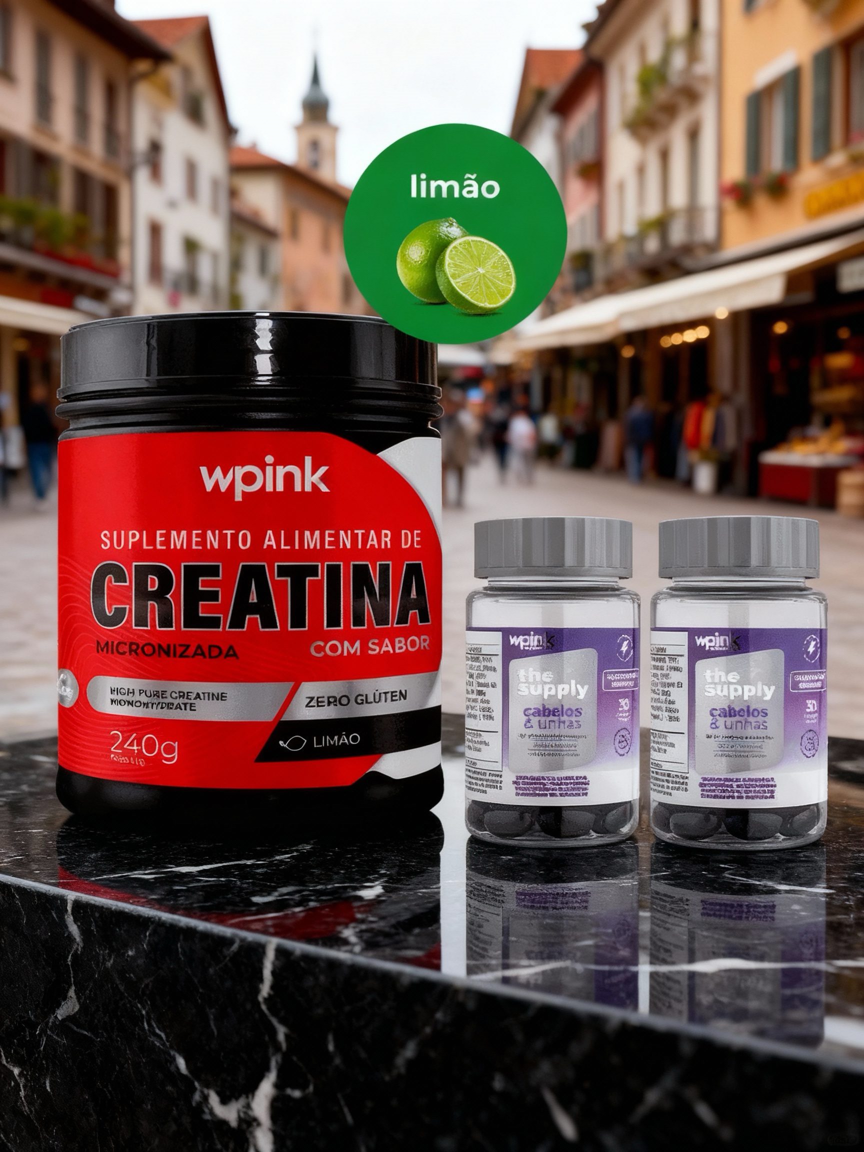 Creatina Micronizada Sabor Limão (240g): potência e desempenho em cada treino! Melhora a força, resistência e recuperação muscular, com um sabor leve e refrescante.