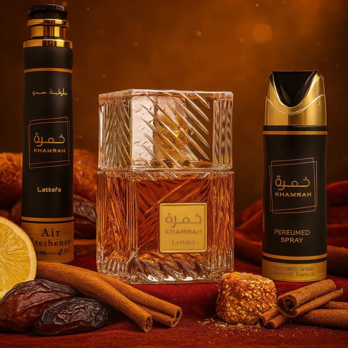 O Conjunto de Oferta Khamrah da Lattafa oferece uma experiência sensorial única através de aromas quentes, picantes e orientais. Este conjunto excecional reúne uma fragrância encantadora, um spray corporal perfumado e um elegante difusor, permitindo prolongar a experiência olfativa de Khamrah em todos os momentos do seu dia.