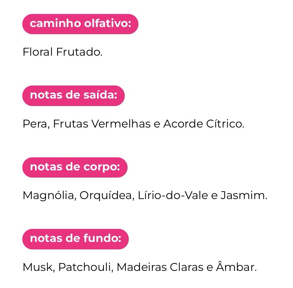No coração, flores nobres como magnólia, orquídea, lírio-do-vale e jasmim revelam uma feminilidade delicada e sofisticada. O fundo suave de musk, patchouli, madeiras claras e âmbar finaliza o perfume com conforto e elegância, deixando um rastro sutil que acompanha sua rotina do início ao fim do dia.
