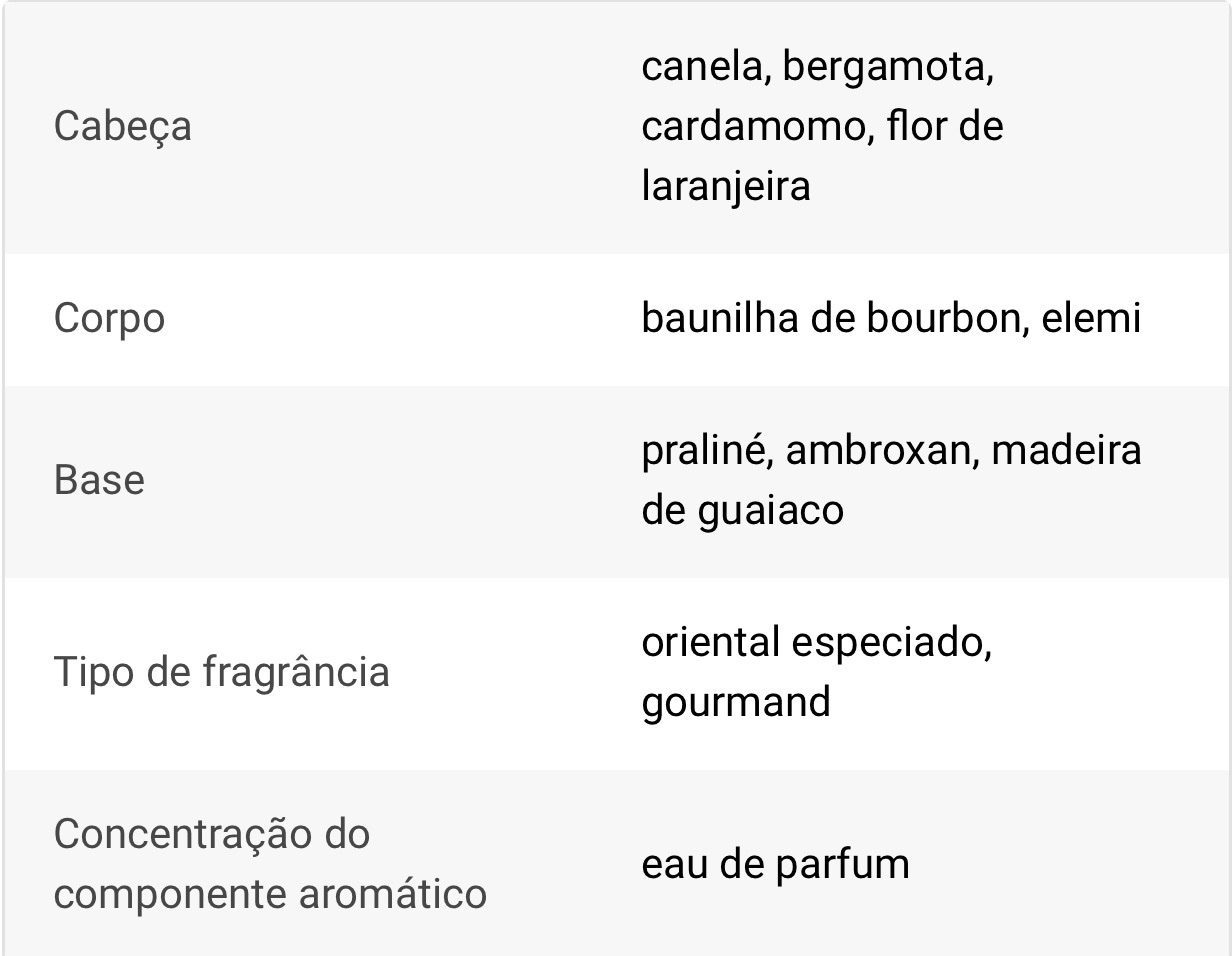 A fragrância abre com uma mistura subtil de canela e bergamota, complementada por flor de laranjeira e cardamomo picante. Mais tarde, desenvolve-se a baunilha doce de bourbon, equilibrada pela resina aromática de elemi. O final é composto por almíscar sensual, madeira de guaiaco quente e praliné delicioso apoiado por ambroxan.