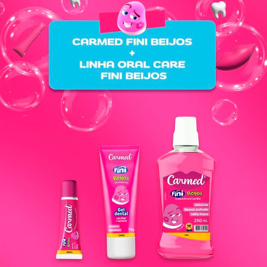 O Kit Carmed Fini Beijos é a combinação perfeita para quem busca cuidados completos de higiene bucal e hidratação labial. O Gel Dental Carmed Fini Beijos oferece proteção anticárie e antiplaca bacteriana, mantendo gengivas saudáveis e hálito fresco. Já o Hidratante Labial Carmed Fini Beijos hidrata profundamente, ajuda a prevenir rachaduras e deixa os lábios macios, com cor rosa, efeito gloss e aroma divertido inspirado nas balas Fini Beijos.