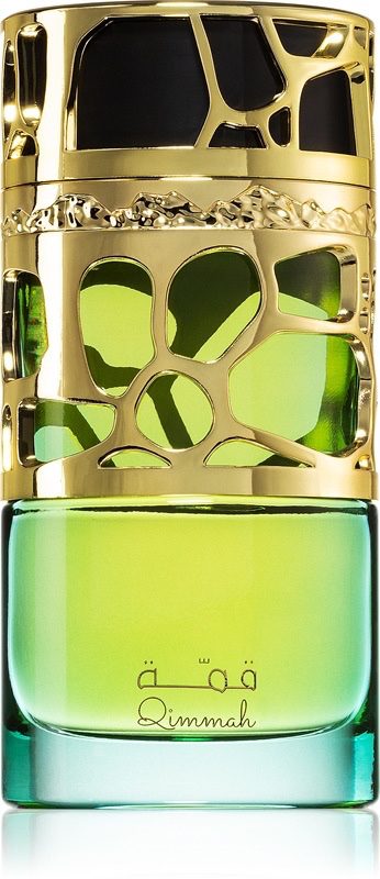 o frasco da eau de parfum Qimmah encanta à primeira vista – o design verde e dourado com uma tampa ornamental evoca a elegância árabe numa versão contemporânea. Este design atua como uma joia – exatamente como a fragrância. Cada nota é como mais um lado de uma personalidade extraordinariamente feminina.