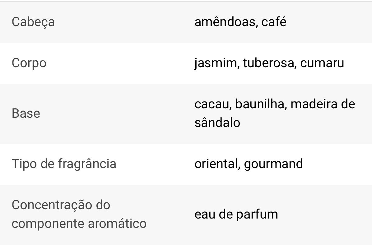 no início será recebida pelo aroma delicioso de café torrado e amêndoas suavemente doces – uma combinação quente e viciante que capta a atenção de imediato. Em seguida, desenvolve-se um rico acorde floral de tuberosa, jasmim e fava tonka que proporciona uma feminilidade cremosa à fragrância. Na base, a fragrância assenta na profundidade sensual de baunilha, cacau e madeira de sândalo que deixa um rasto doce e aveludado.