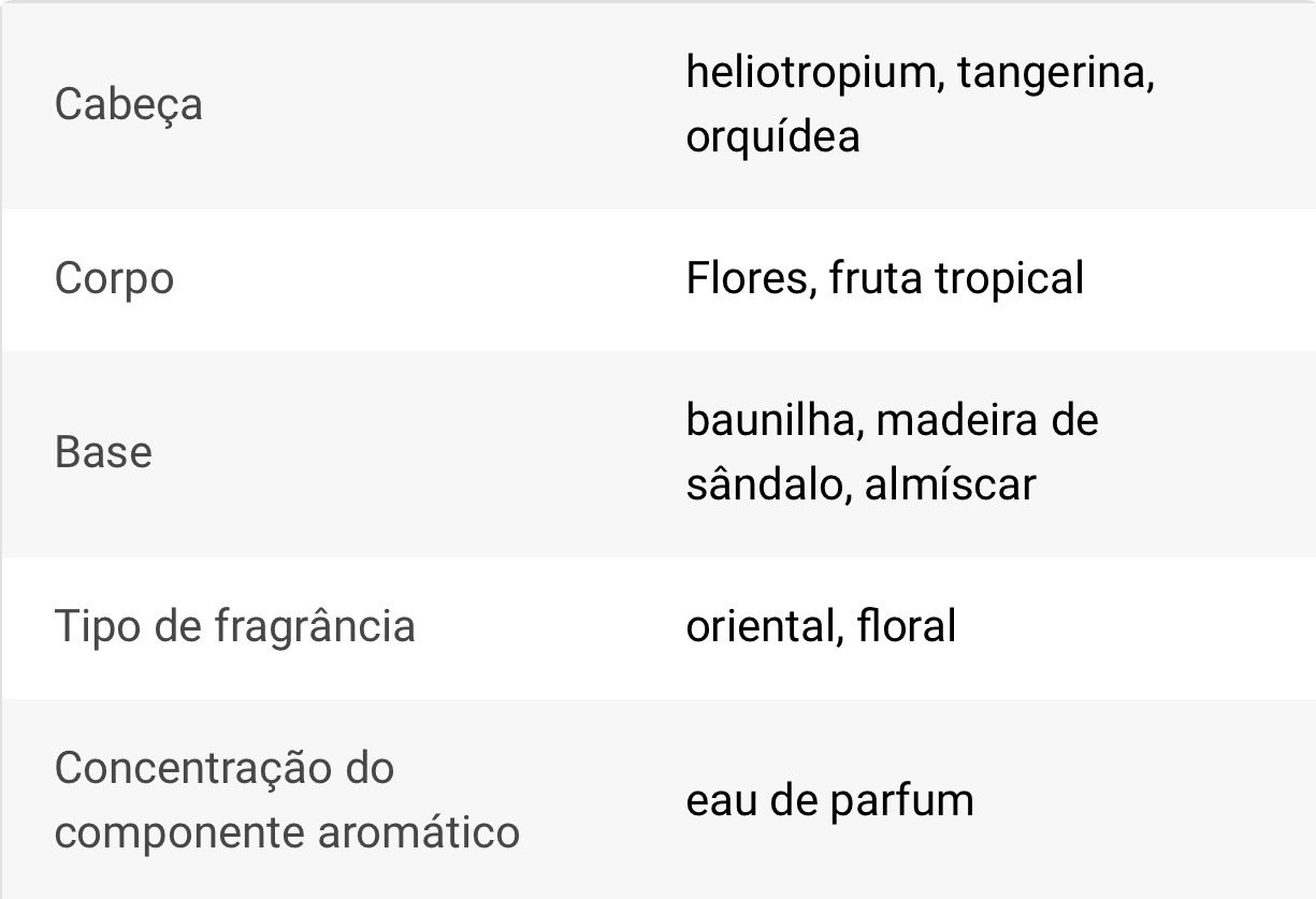 a fragrância abre com a combinação delicada de notas florais de orquídea, heliotrópio e tangerina suculenta. Em seguida, destacam-se as notas de frutos tropicais com um acorde gourmand que proporcionam à fragrância uma profundidade doce e um caráter divertido. O aroma mais duradouro na sua pele será o suave aroma de baunilha, o sensual almíscar e o sândalo quente.