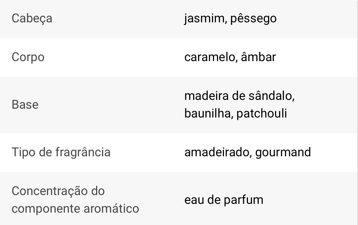 A fragrância abre com uma explosão fresca de pêra sumarenta, na qual se insinua um subtil toque picante de pimenta rosa e a misteriosa essência de groselha preta, criando um início vivo e excitante. À medida que a fragrância amadurece, o coração ressoa com as palmas inebriantes da tuberosa, o jasmim sublime e as amêndoas suaves e aveludadas que trazem um abraço quente e sensual à composição. As notas de base unem-se então numa sinfonia rica de baunilha, caxemira cremosa e patchouli terroso, deixando uma marca inesquecível e profunda que permanece consigo durante muito tempo.
