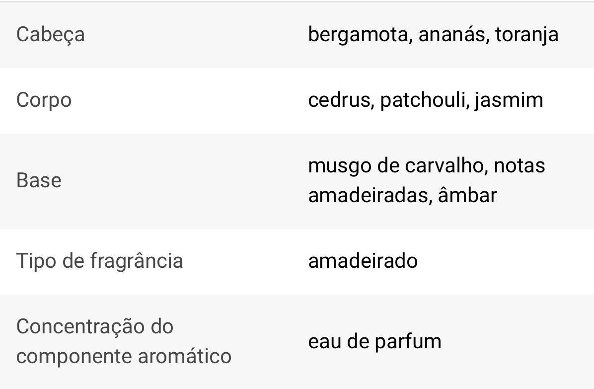 A abertura revela a bergamota fresca, o ananás suculento e a vibrante toranja, que conferem à fragrância energia e brilho. A composição evolui com o patchouli terroso e aromático, a elegante madeira de cedro e o jasmim de delicado toque floral, que conferem à fragrância uma nota de suavidade. No final, a fragrância assenta em notas de musgo de carvalho perfumado, madeira quente e âmbar resinoso e sensual.