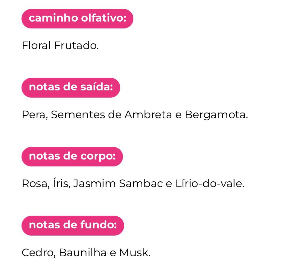 A abertura fresca e frutada desperta os sentidos com brilho e leveza. A pera suculenta encontra a bergamota em uma combinação luminosa e envolvente, criando um início vibrante, feminino e delicadamente adocicado.